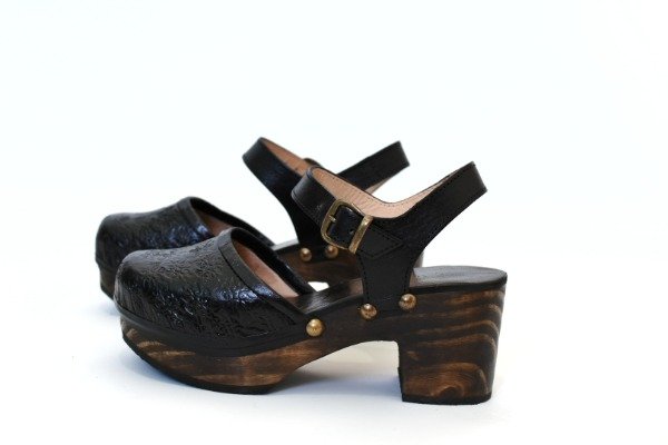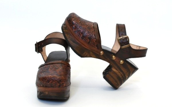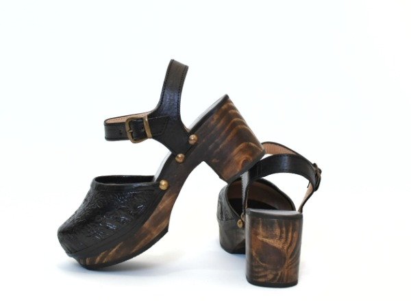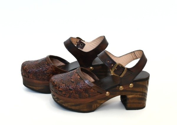 Sandalia de cuero vacuno con base de madera forrada y acolchada, alto del taco 7 cm.