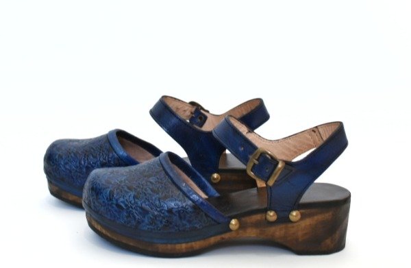 Sandalia de cuero vacuno con base de madera forrada y acolchada, alto del taco 5 cm.