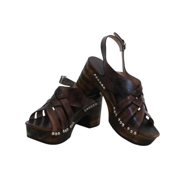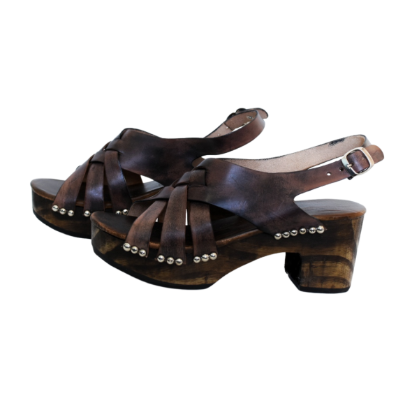 Sandalia de cuero vacuno con base de madera forrada y acolchada, alto del taco 7 cm.