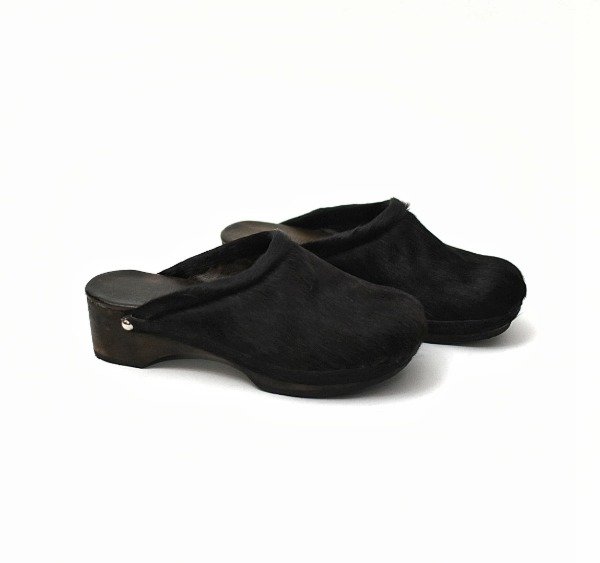 Zueco de cuero vacuno forrado con pelo, base de madera forrada y acolchada, alto del taco 5 cm.