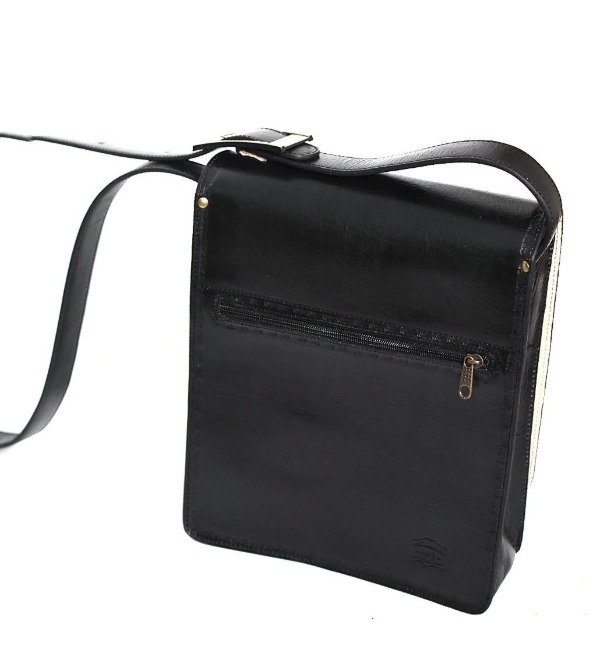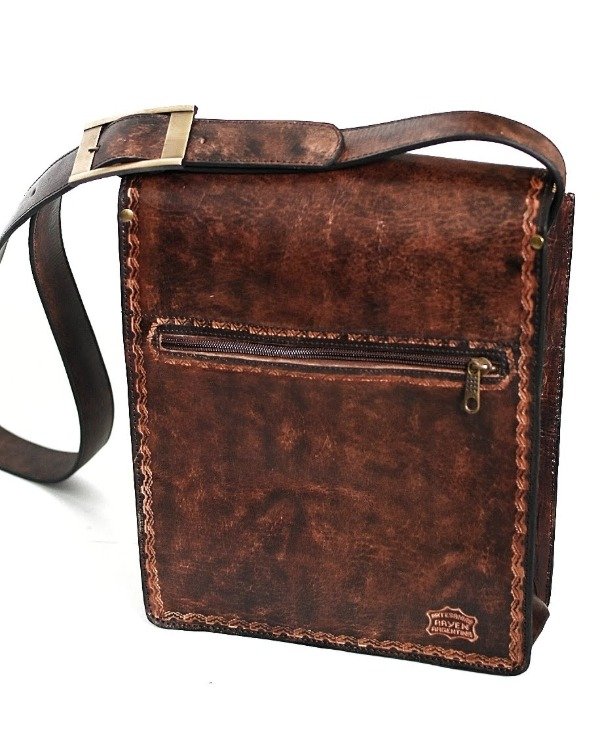 Morral de cuero vacuno con cierre trasero.